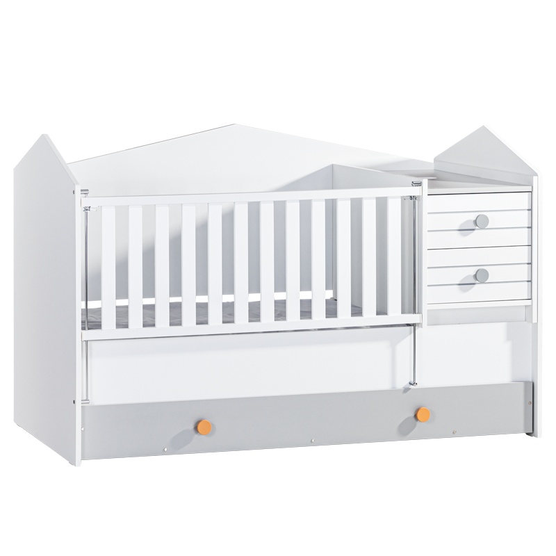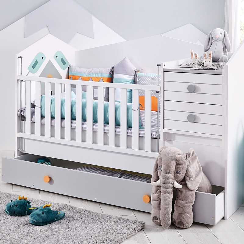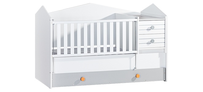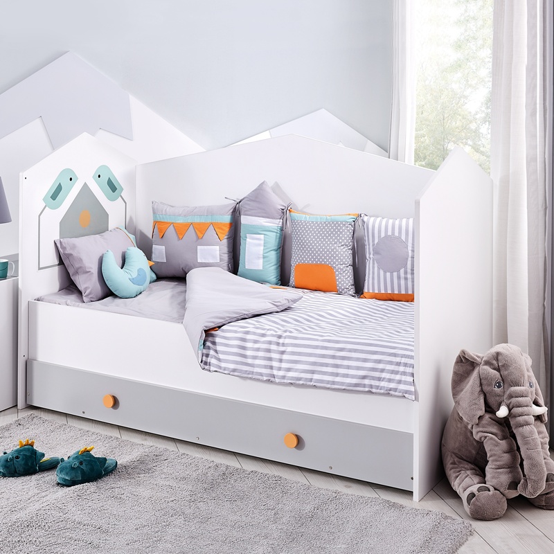 Изберете трансформираща кошара-легло BIRD HOUSE, която ще превърне стаята на вашето дете в приятно и уютно място. Със своите интересни форми, приличащи на къщичка, това легло добавя естествена красота в интериора. Може да се използва от бебешка възраст до 12 години, като предлага гъвкавост и удобство. С подвижното шкафче-масичка, леглото лесно се превръща в просторен диван-легло, създавайки комфортна зона за почивка. Долната част с чекмеджета осигурява допълнително място за съхранение, което увеличава функционалността на стаята. Пълна информация за размерите и характеристиките на модела ще намерите в таблицата в таб/поле "Техническа информация".
