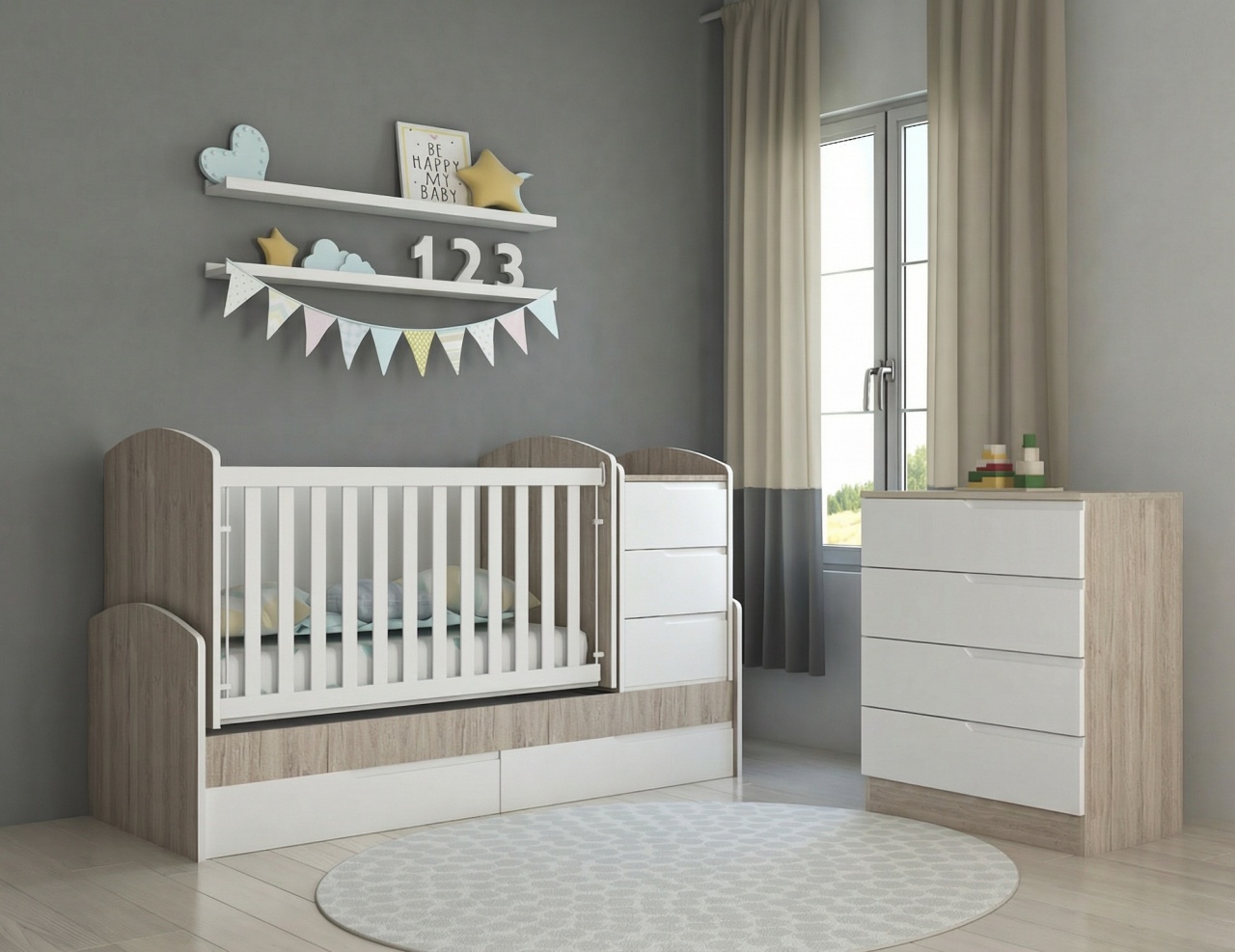 Обзавеждане с трансформираща се бебешка кошара СЪНИ и скрин СЪНИ