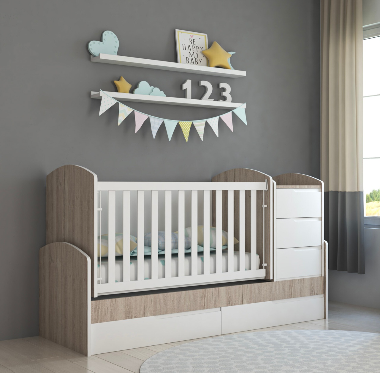 Бебешка трансформираща се кошара и детско легло от ПДЧ и МДФ със скрити дръжки СЪНИ