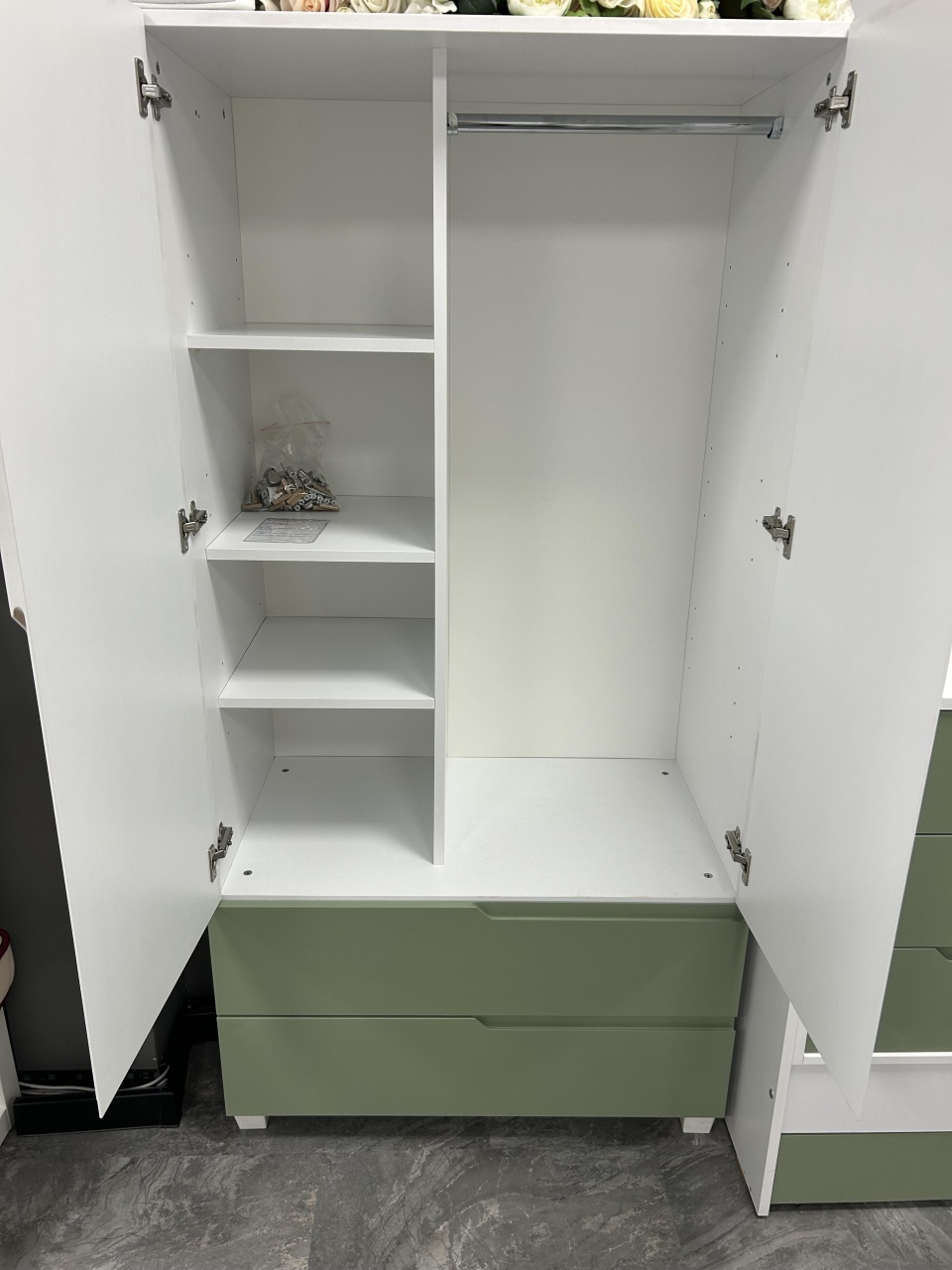 - разпределение - вижте на снимката - от едната страна рафтове, а от другата - лост за закачалки