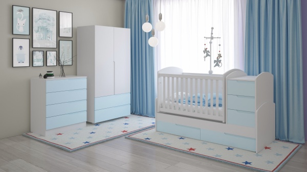 Обзавеждане с трансформираща се бебешка кошара Съни, скрин Съни, Гардероб Съни