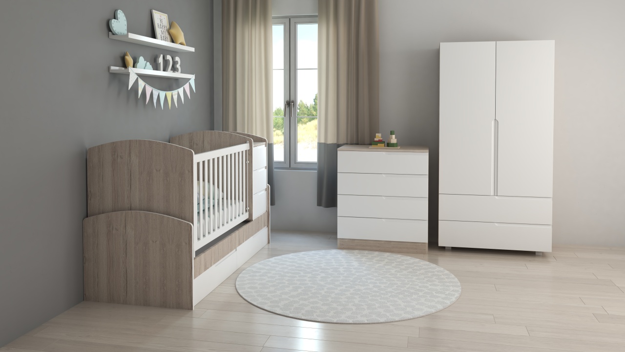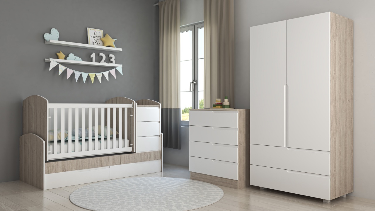 Обзавеждане с трансформираща се бебешка кошара Съни, скрин Съни, Гардероб Съни